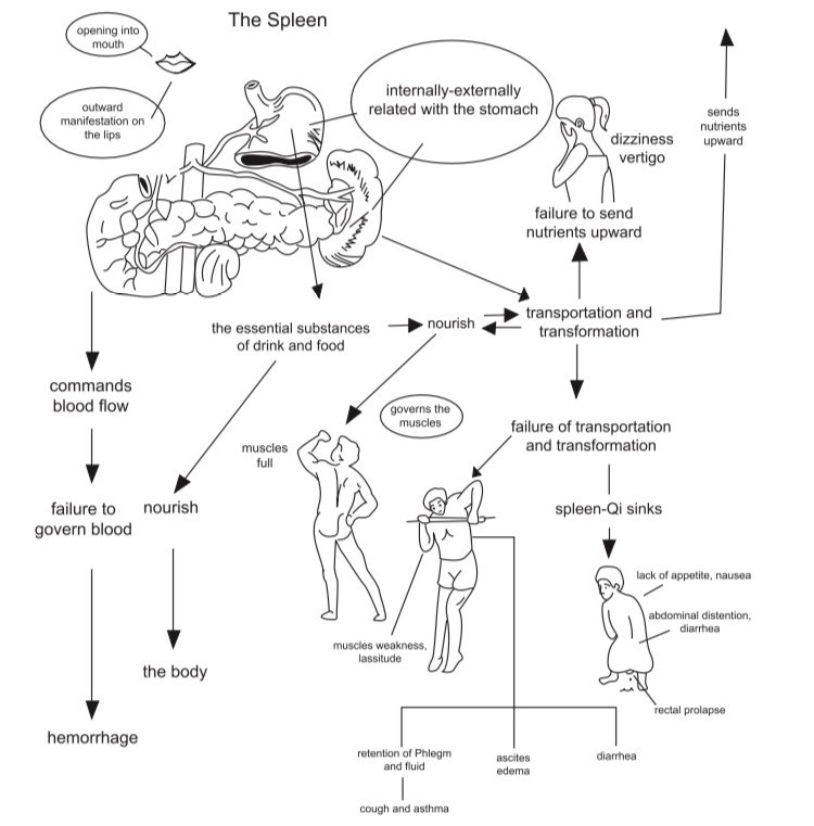 As atividades de digestão dos alimentos e absorção das substâncias nutritivas são executadas conjuntamente por vários órgãos zang e fu. Alimentos e bebidas são introduzidos no estômago. Após a decomposição e fermentação pelo baço e estômago, o lodo é transportado para o intestino delgado. No intestino delgado, o claro é separado do turvo e os dois são impelidos por caminhos separados. As substâncias nutritivas, que se encontram na porção límpida, são absorvidas e transportadas pelo baço para o coração, o pulmão e o resto do corpo, nutrindo todos os órgãos e tecidos. Todo esse processo é a função de transporte e transformação do baço. - Transporte e transformação da umidade-água. Isso se refere à importante função do baço na absorção, distribuição e excreção de fluidos. No processo de metabolismo da água e distribuição de fluidos por todo o corpo, o pulmão, o baço, o rim, o fígado e os outros órgãos viscerais estão todos intimamente ligados ao Baço. No entanto, o baço tem um papel central; e essa função tem dois aspectos principais. Primeiro, o baço pega a água absorvida, transforma-a em fluidos corporais e entrega-a ao pulmão. O pulmão e o coração então o distribuem por todo o corpo para realizar suas tarefas de nutrir e umedecer. Em segundo lugar, após os vários órgãos e tecidos terem extraído nutrientes dos fluidos administrados, o baço distribui os fluidos residuais para os órgãos apropriados para serem excretados do corpo como suor ou urina.
